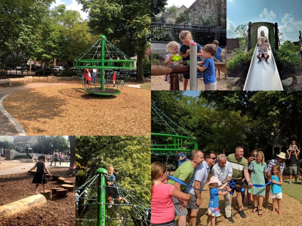 Juniper Park, a Chicago Park District neighborhood playground located in the Lakeview neighborhood of Chicago, needed major renovations. The Lakota Group was hired to lead the design of a new play area that includes elements to stimulate children’s sensory, motor, cognitive, and social/emotions skills. The design includes nature-based play elements such as log steppers, log balance beams, a sand play area, a hill slide, and outcropping stones. It also includes standard play elements—tot swings, basket swings, and a rope spinner—as well as a spray pool and winding paths throughout the mature trees. The playground just opened to the public in August!