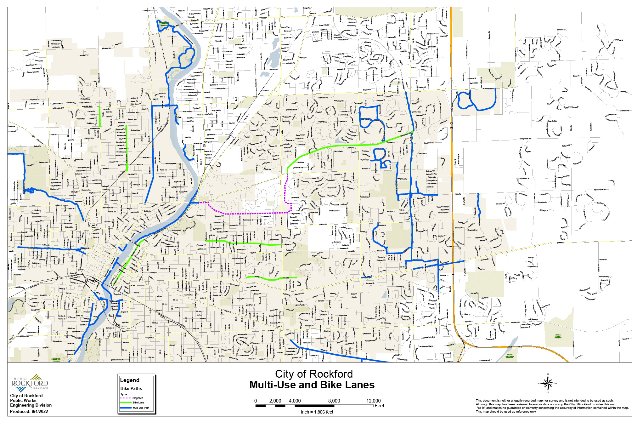 From the Public Engagement and Steering Committee the City’s Second 10-Year Bike Plan titled The City of Rockford Bikeway Implementation Plan was drafted and passed by City Council in 2020. Rather than continuing with large growth of the system, the new bike plan looks to balance expansion with increasing rider comfort by creating more bike lanes, multi-use paths, establishing traffic calming and installing bike detection at some signalized intersection.